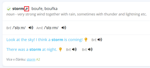 Ikonka klíče se zobrazuje při klasickém vyhledávání v aplikaci, v prohlížení slovíček v jednotlivých okruzích, i v našem kontextovém slovníčku (při dvojkliku na kterékoliv slovo v aplikaci).