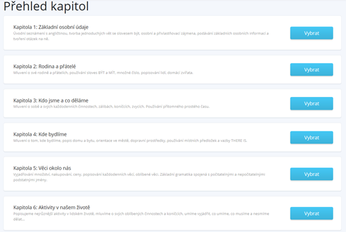 Základy angličtiny jsou v tomto kurzu seskupeny do sedmi kapitol. Každá kapitola se skládá z přibližně 30 jednoduchých, krátkých a lehce stravitelných lekcí, které si můžete pohodlně číst na počítači ale i v mobilním telefonu či tabletu.