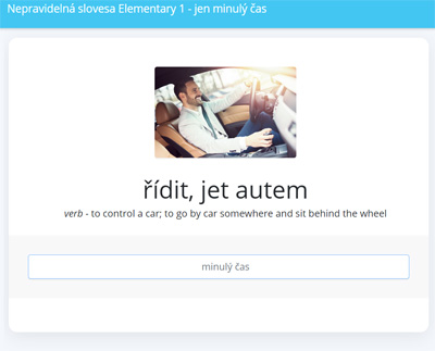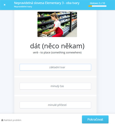 U každého z těchto okruhů si můžete zvolit způsob zkoušení buď všech tvarů, nebo pouze základního a minulého tvaru. V případě první možnosti bude aplikace chtít na základě českého významu vepsat tvar infinitivu, minulého času i minulého příčestí: