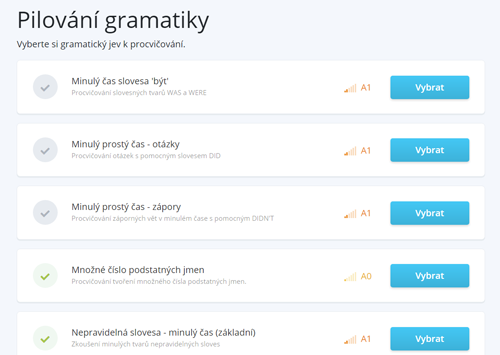 Která konkrétní drilová cvičení jsou určena pro vaši úroveň, zjistíte po otevření sekce Samostudium / Gramatika / Pilování gramatiky. Všechna pilování (bez ohledu na úroveň) jsou zároveň dostupná přímo z rejstříku gramatických jevů.
