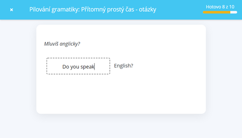 3. Aplikace English Me sama vytvoří cvičení, kde z vybraných vět použije 10 vět odpovídajících vaší nastavené úrovni pokročilosti. V tomto cvičení budete mít za úkol do každé věty danou strukturu správně napsat. Po dokončení aktivity můžete skončit anebo pokračovat s dalšími deseti větami, a to tak dlouho, dokud nebudete mít pocit, že již danou strukturu máte pevně zafixovanou (nebo dokud nedojdou věty).