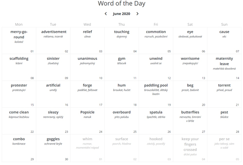 Slovíčka naleznete také v kalendářovém přehledu, který si můžete otevřít také z horní zelené lišty v sekci Samostudium. Po kliknutí na ikonu kalendáře se rozbalí přehled pro aktuální měsíc. Listovat lze zpětně všemi měsíci a každé slovíčko si přečíst.